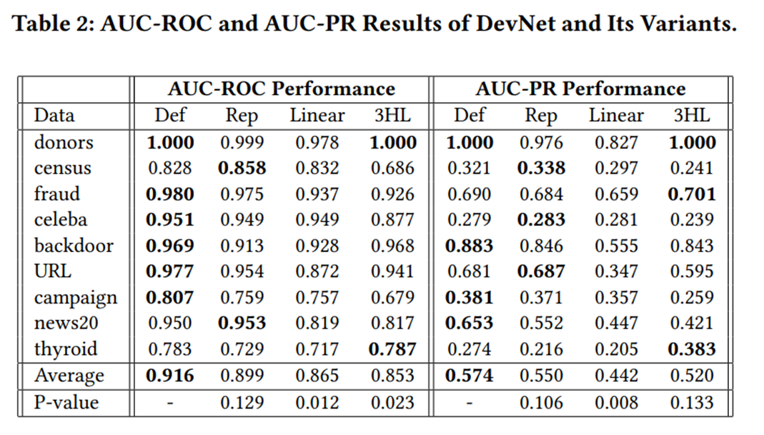 대부분의 데이터셋에서 AUROC는 본 DevNet의 성능이 우수하였습니다. 하지만 AUC-PR의 경우 일부분에서 Rep나 3HL이 더 우수하게 나온 경우도 존재하였음을 알 수 있습니다. 특히 census 데이터의 경우는 Rep에서 성능이 가장 우수했음도 확인할 수 있었습니다.