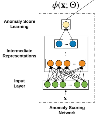 Anomaly score를 도출하는 네트워크의 경우 2개의 세부적인 구조를 가짐을 알 수 있는데, input이 들어오고 나면 representation을 만드는 'Intermediate representation' layer와 이를 바탕으로 곧바로 anomaly score를 도출하는 layer로 구성이 되어 있습니다. 이에 대한 구체적인 구조는 뒤에서 자세하게 다루겠습니다.