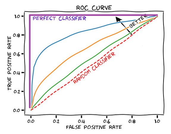 빨간 점선처럼 선이 형성되는 경우 random하게 classifier한 경우와 동일합니다. 그리고 빨간 점 아래에서 영역이 형성되는 경우는 0.5죠. 반면 보라색의 선의 경우 가장 모형이 강력한 경우, 즉 모든 경우를 맞춘 경우로 아래 면적은 1이 됩니다.