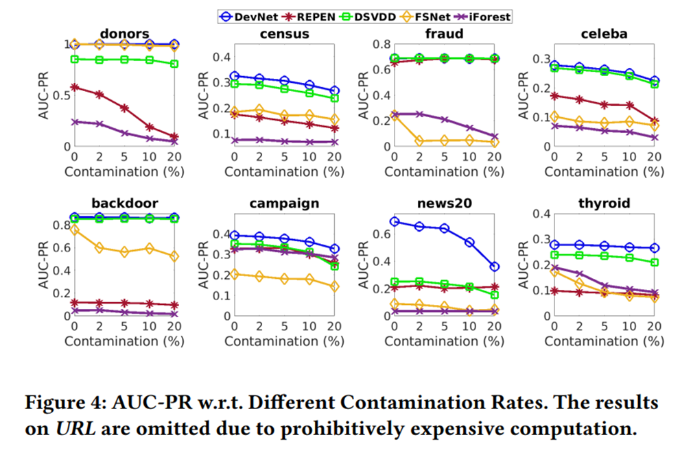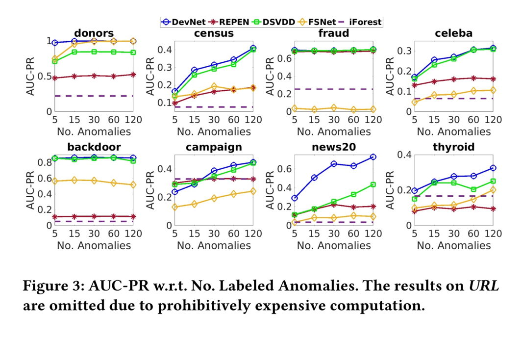 추가되는 anomalies의 수에 대해 가장 높은 성능을 DevNet이 보임을 알 수 있습니다. 특별히 campaign, census, news20, thyroid 데이터에 대해서 추가되는 anomalies label에 대해 더 큰 폭의 성능의 향상을 보임을 확인할 수 있었습니다.