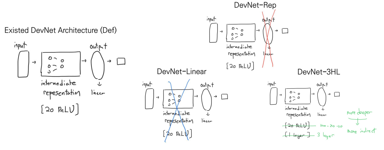 즉, 기존의 Def가 DevNet이라면, 각각의 구성 요소를 하나씩 제거하거나 layer를 3개로 늘리는 조작을 가하게 됩니다.