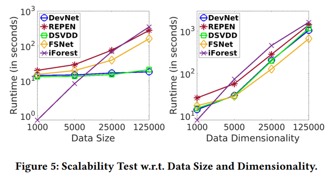 대부분의 모형에서 linear time이 소모되었지만, DevNet의 경우 data size에 대해서는 크기가 10만이 넘어가는 영역에서도 준수한 속도를 보임을 확인할 수 있었습니다. dimension에 대해서도 FSNet보다는 느리지만 다른 타 모형에 비해 더 빠른 성능을 보임을 알 수 있었습니다.