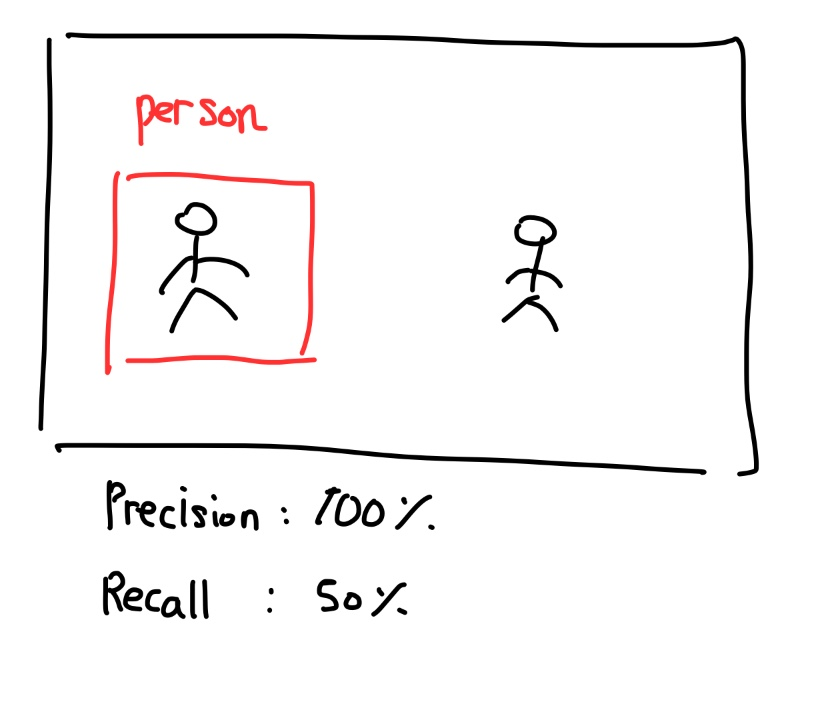 Object Detection을 수행하는 task를 예로 들어보죠. 여기서 모형이 다음과 같이 사람 2명이 있는 사진에서 한 사람을 탐지하고 이를 사람이라고 예측을 해봤다고 해봅시다. Precision 관점에서는 내가 예측을 시도한 경우가 다 잘 들어맞았다고 생각해서 100%의 정확도를 갖는다고 이야기합니다. 하지만 Recall 관점은 조금 다르죠. 사람이 실제로 한 명 더 있는데 이 사람은 맞추지를 못했으니 정확도는 50%이라고 이야기하는 겁니다.