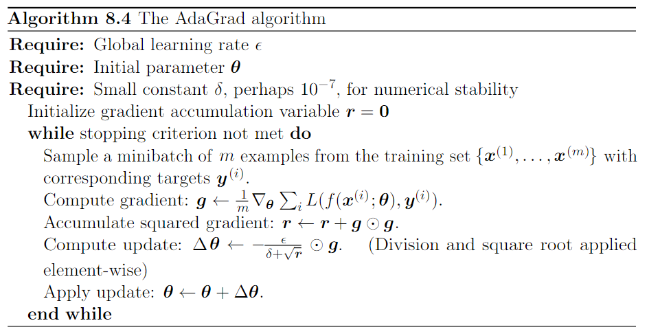 AdaGrad는 update할 때 각각의 변수마다 step size를 다르게 설정해서 업데이트를 수행하는 것을 기초로 합니다. 즉, 지금까지 많이 변화하지 않은 변수들은 step size를 크게 하고, 지금까지 많이 변화했던 변수들은 step size를 작게 하자는 아이디어에 기초합니다. 왜냐하면 변수가 자주 update 된다면 최적 값에 가까워졌다는 것을 의미하고, 이 때 이동거리를 짧게 주면 최적 값을 지나치지 않고 찾을 수 있게 됩니다. 하지만 반대로 업데이트가 자주되지 않는 변수의 경우, 이동 거리를 크게 해서 최적 값에 가깝게 만들어 시간을 단축하는 방법으로 동작을 수행합니다.